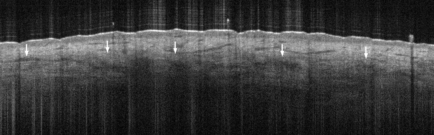 Reticular Dermis Lowest visible layer of follicular skin Hyporeflective mottled texture due to hyperreflective collagen bundles and a high fluid content from tissue fluid perfusion and vessels Leave a comment Cancel reply You must be logged in to post a comment.