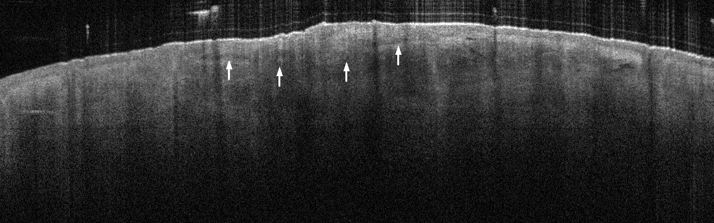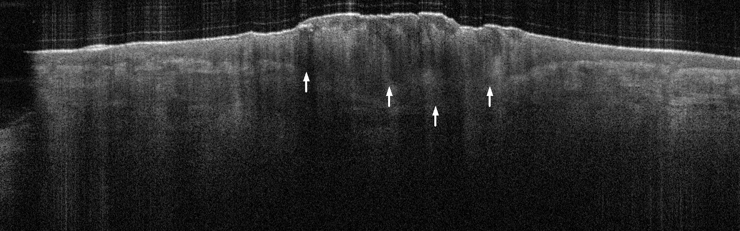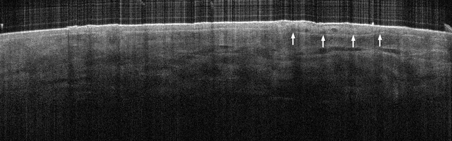 - White arrows indicate return to dermal collagen texture and reflectivity